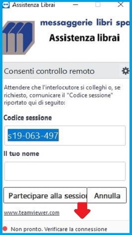 Completato il passaggio precedente, si può avviare il file scaricato. Nella finestra Team Viewer che si apre è disponibile il codice sessione da comunicare all'operatore che richiede il controllo remoto del PC non appena il software risulterà Pronto alla connessione
